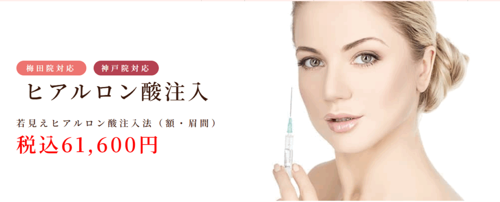 | ヒアルロン酸注射の料金(一例) | ヒアルロン酸(RHA1) 1.0cc:35,000円(税込) |