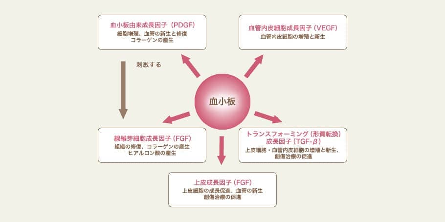 血管が損傷した時に、傷口に集まり、粘着、凝集して傷口をふさぎ出血を止める作用があります。その時、血小板から放出されるのが成長因子(Growth